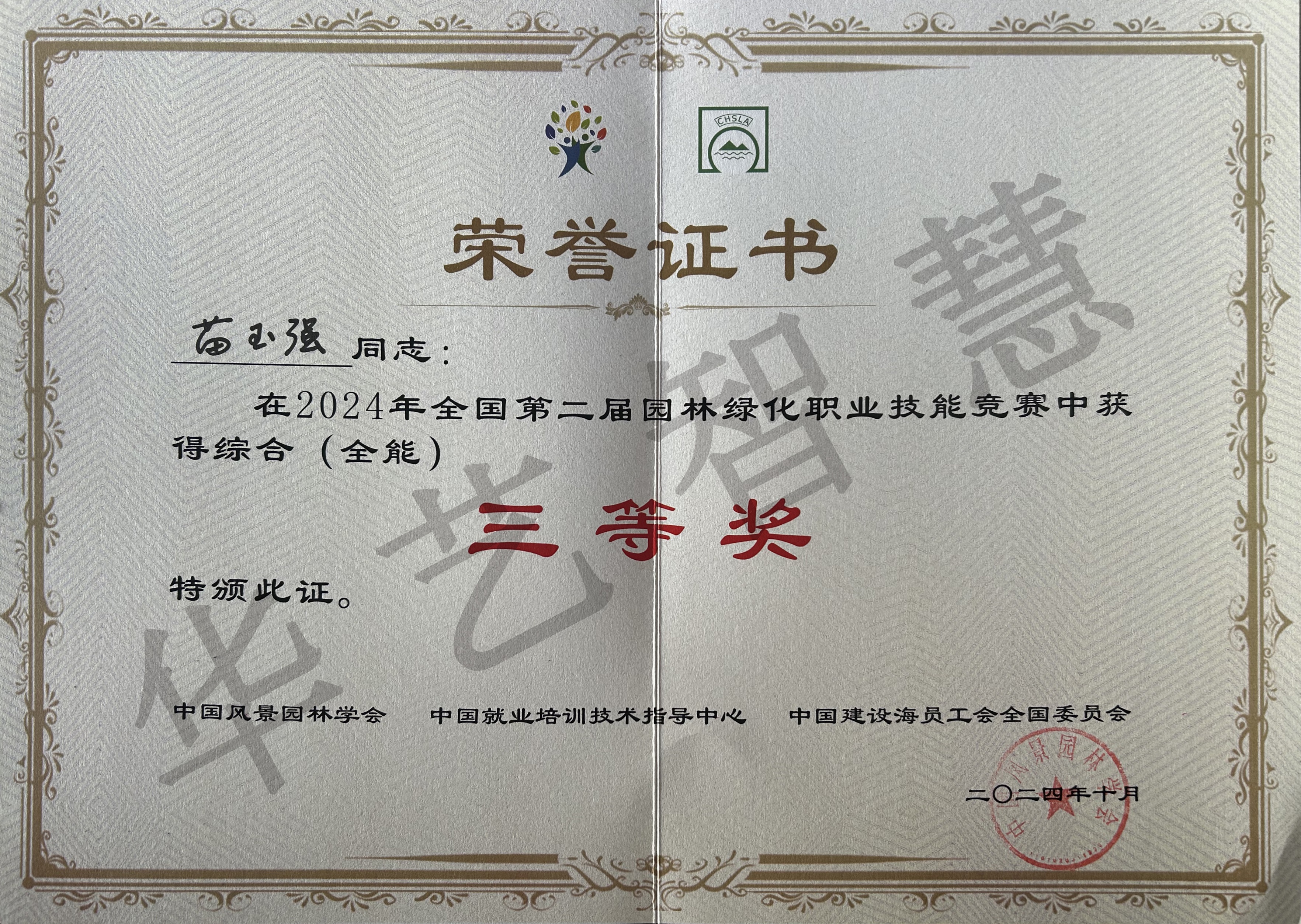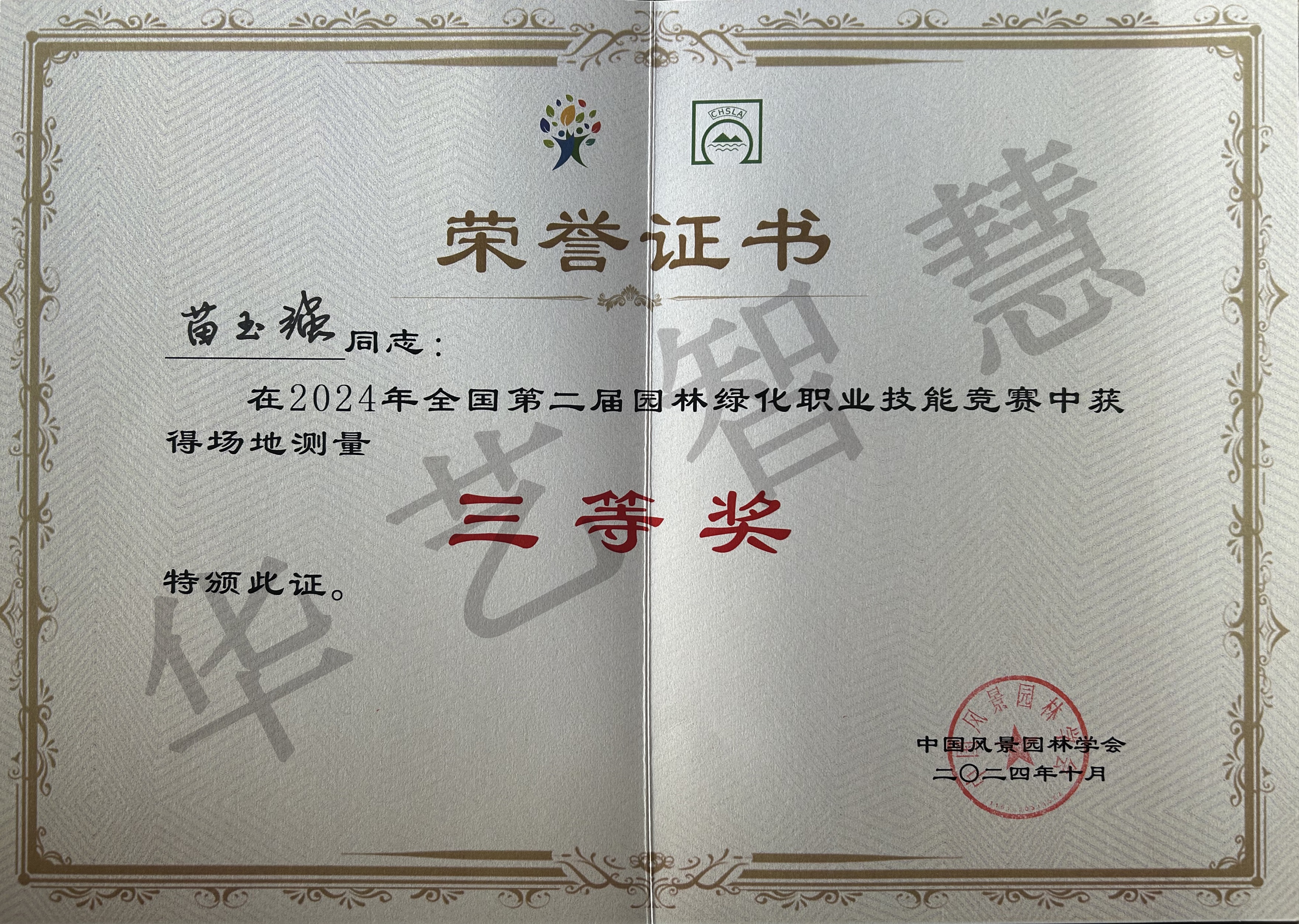 2024年10月25—28日,由中國風(fēng)景園林學(xué)會、中國就業(yè)培訓(xùn)技術(shù)指導(dǎo)中心和中國海員建設(shè)工會全國委員會聯(lián)合主辦的“2024年全國第二屆園林綠化職業(yè)技能競賽”在北京隆重舉行。華藝智慧科技股份有限公司工程師苗玉強(qiáng)憑借扎實的專業(yè)知識、精湛的技藝和卓越的團(tuán)隊協(xié)作精神,從眾多選手中脫穎而出,榮獲綜合(全能)三等獎、場地測量三等獎。