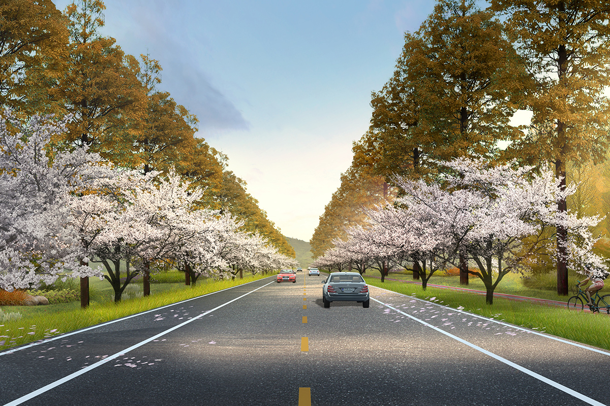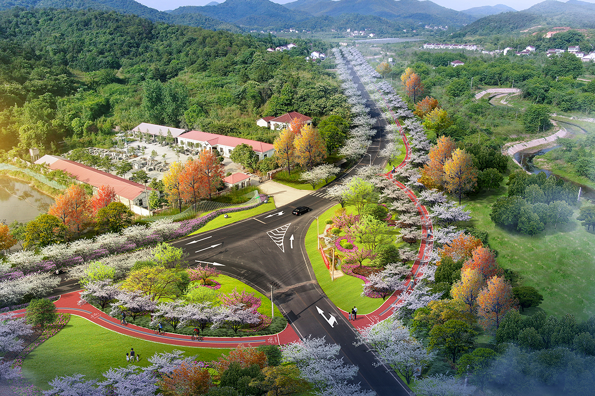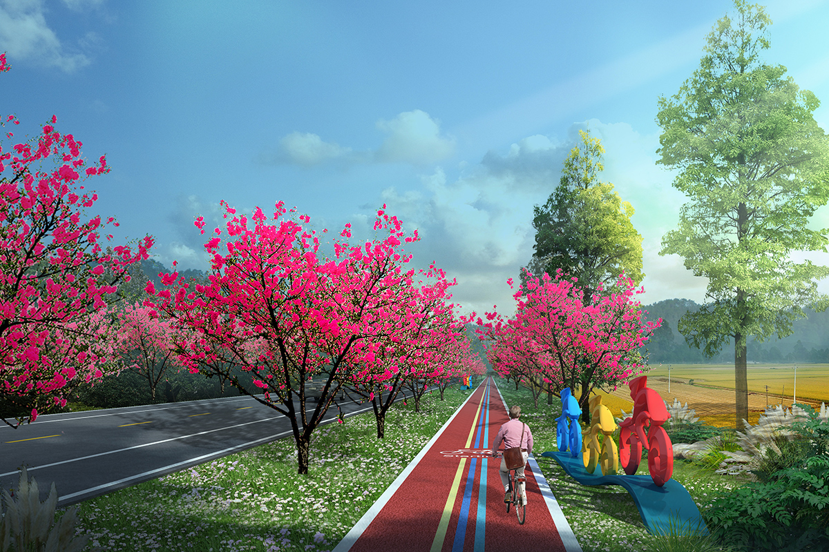 設(shè)計(jì)以健身綠道貫穿始終,并串聯(lián)多個(gè)景觀節(jié)點(diǎn)、文化節(jié)點(diǎn)和服務(wù)驛站。以繁昌青梅為主題元素,全段道路兩側(cè)采用青梅陣列種植,打造繁昌青梅大道特色景觀,綠道外側(cè)采用水杉和楓香間隔交錯(cuò)種植,地被采用自然多年生子播花草組合,體現(xiàn)鄉(xiāng)野自然植物景觀空間,下層植物空間主要以通透為主,滿足綠道游客觀賞繁昌田園風(fēng)光景色。